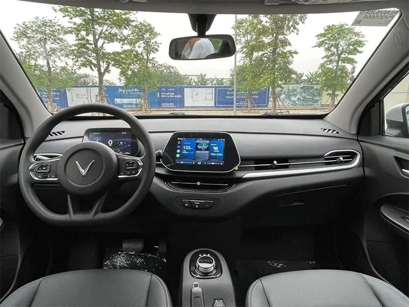 Vốn theo đuổi phong cách thiết kế tối giản nên khoang cabin VF 5 trông khá đơn giản nhưng không kém phần hiện đại với sự hiện diện của 2 màn hình điện tử. Trong đó, màn hình phía sau vô-lăng đặt nổi thay cho dạng analog truyền thống và màn hình cảm ứng cỡ lớn ngay trung tâm táp-lô.